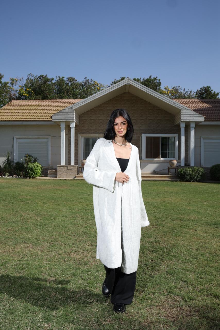 Long light grey knit cardigan, sleek and pocket-free — soft, elegant, and made to flow with every move.