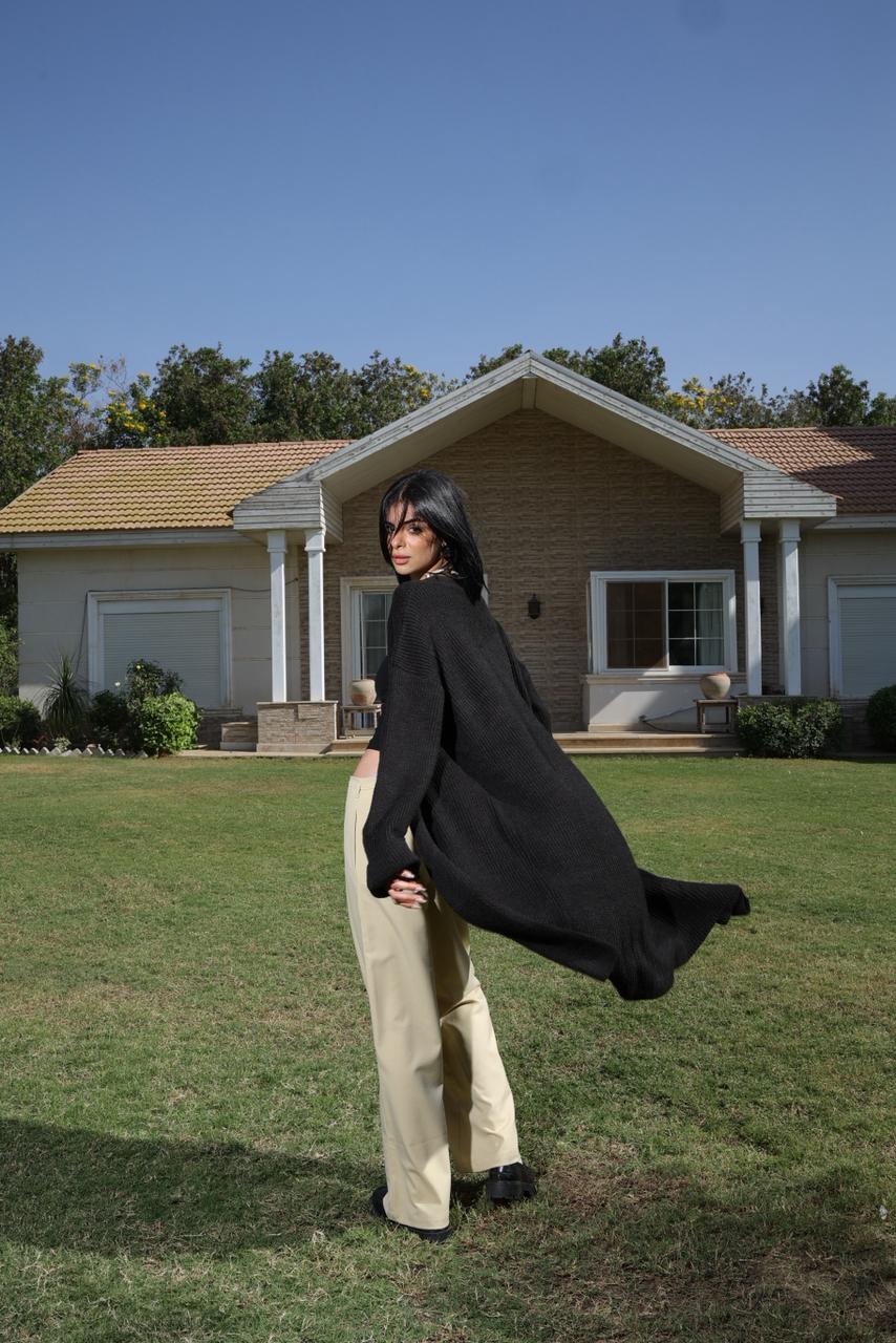 Long black knit cardigan, sleek and pocket-free — soft, elegant, and made to flow with every move.