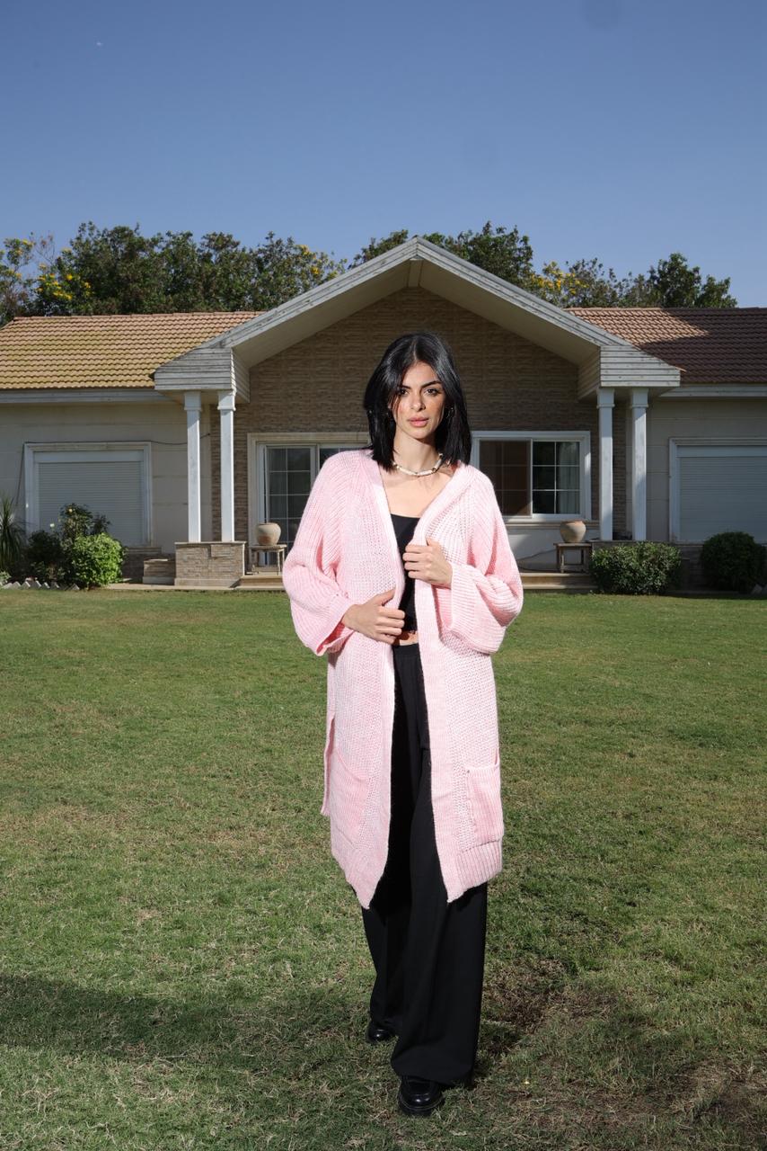 Soft pink knit cardigan, knee-length with front pockets ,cozy, feminine, and effortlessly chic.