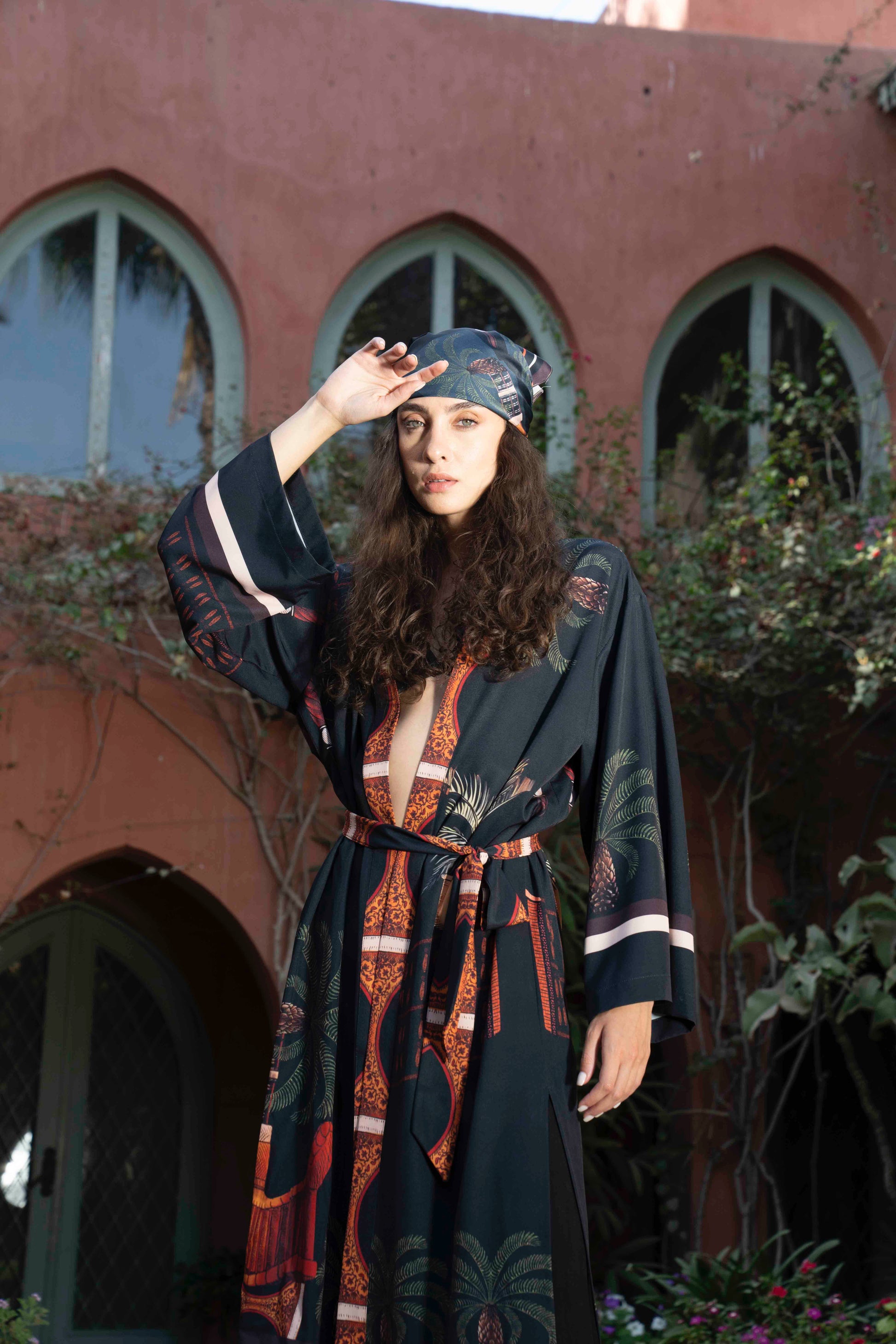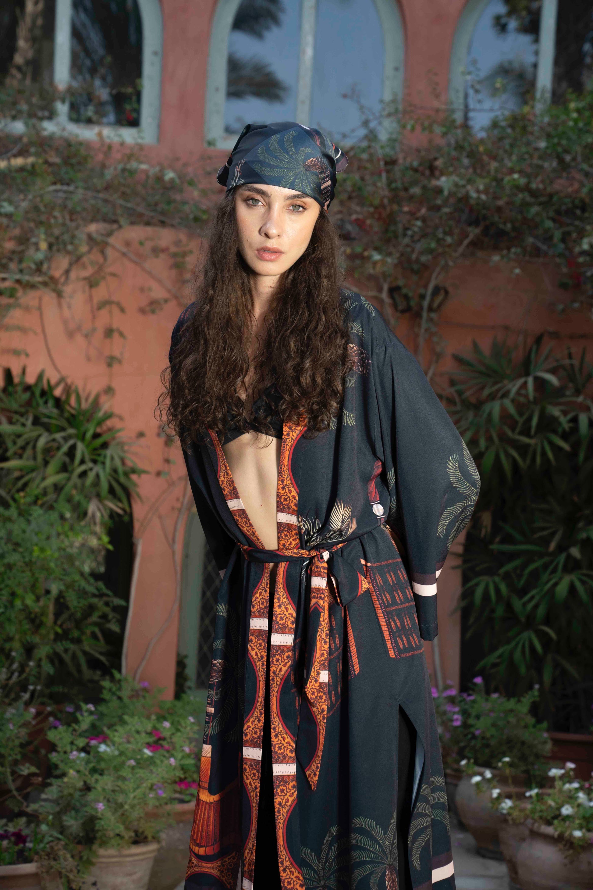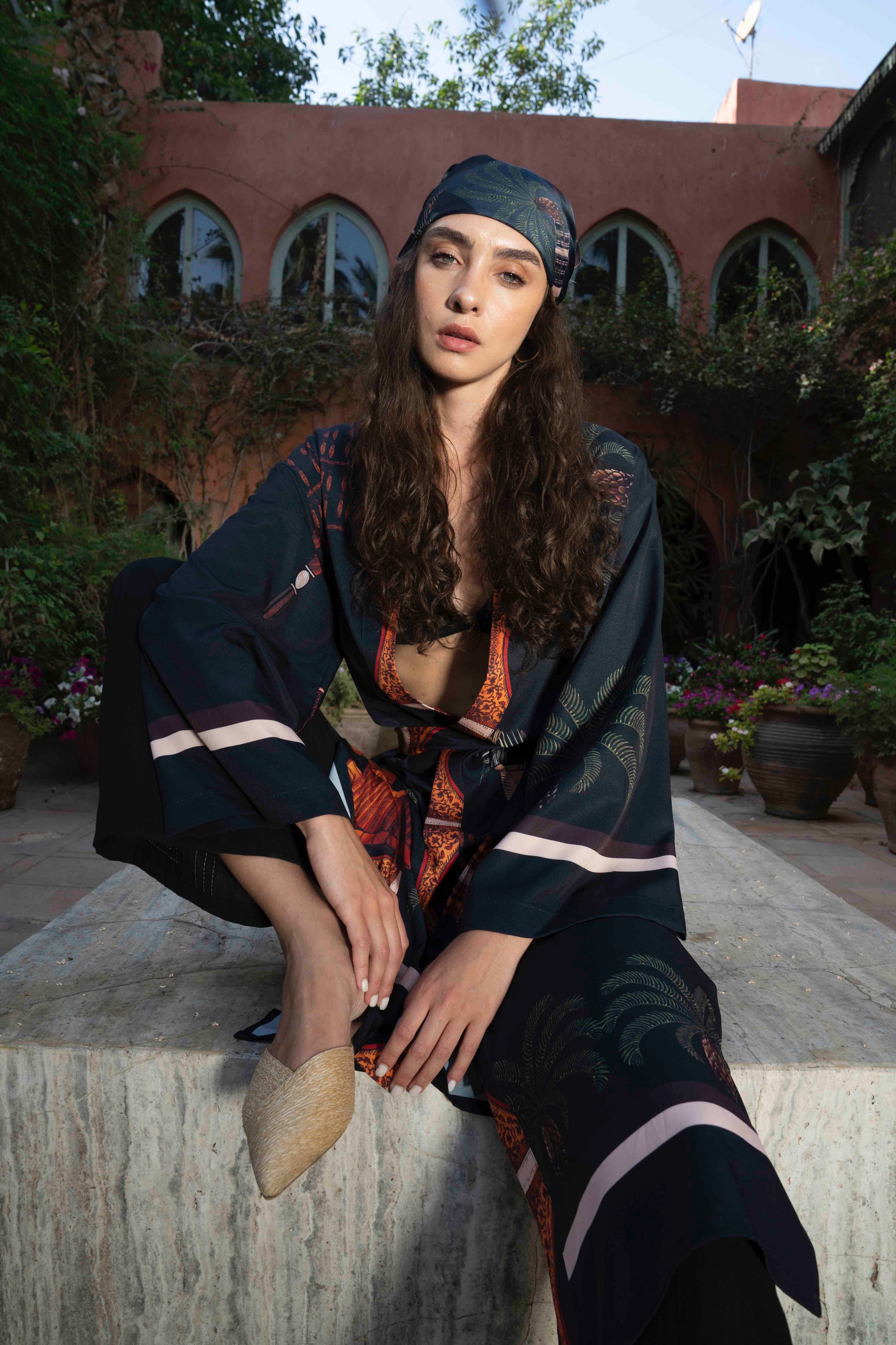 This wild and artistic ensemble features a long, printed kimono-style jacket paired with wide-leg black pants for a striking bohemian look. The matching headscarf and coordinated tones add a touch of effortless edge and sophistication.